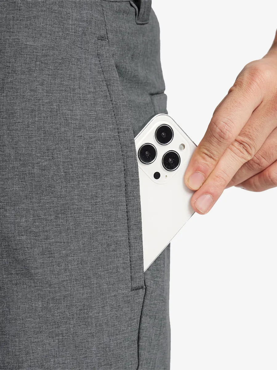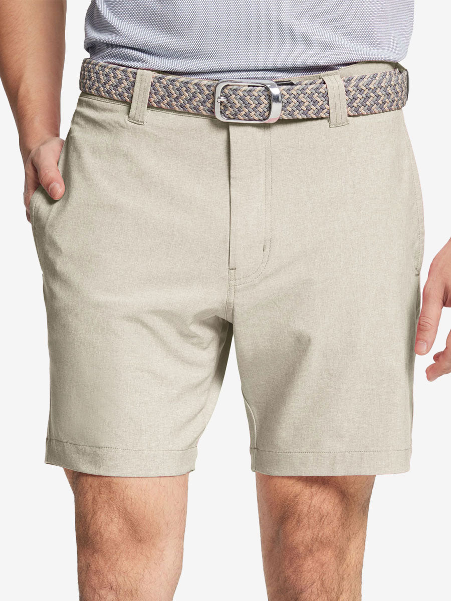 Presentamos nuestros pantalones cortos de golf Heather Performance, diseñados para ofrecer comodidad y flexibilidad con materiales respetuosos con la piel y una excelente elasticidad. Estos pantalones cortos para hombre cuentan con propiedades de absorción de humedad, secado rápido y UPF 50+ para una mayor transpirabilidad y frescura. Mejorados con elegantes detalles jaspeados, son perfectos para el campo de golf o para uso casual, combinando moda con funcionalidad sin esfuerzo.